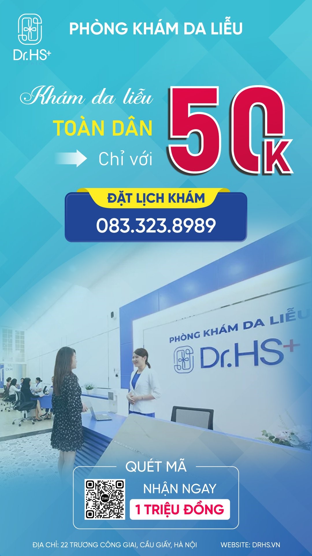 Từ tháng 10, Phòng khám Da diễu Dr.Hs+ ở địa chỉ 22 Trương Công Giai, Cầu Giấy, Hà Nội tổ chức chiến dịch khám da liễu toàn dân chỉ từ 50.0000 đồng/lần.